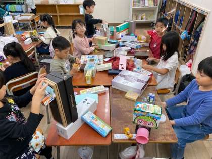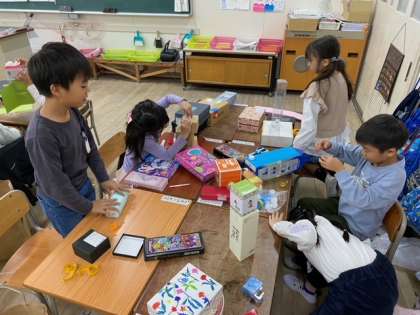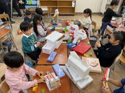 1年生の生活科では、『はこでつくったよ』ということで、普段使っている箱の形や絵柄などを生かして何やら生き物をつくっていました。