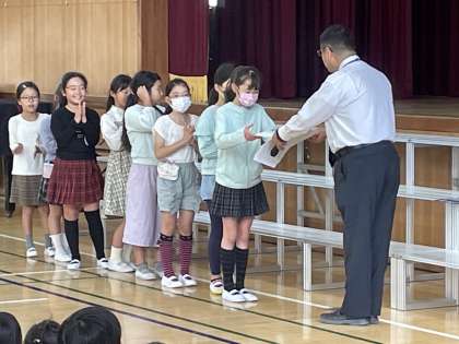 今日の児童朝会では、まずバトンの認定試験に合格した子たちに校長先生から認定書が渡されました。