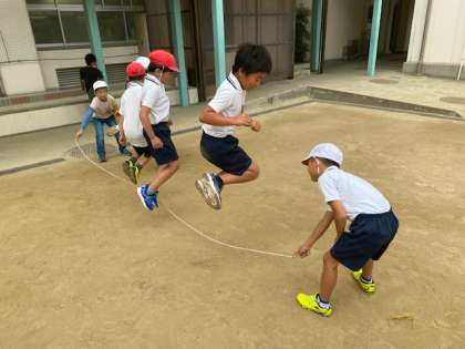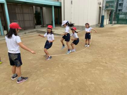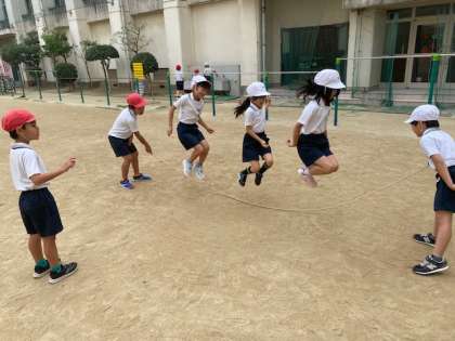 2年生の体育では、長縄を使ったグループ跳びにチャレンジしていました。