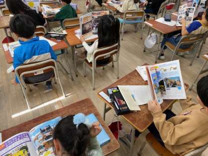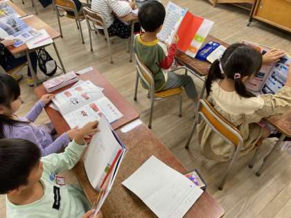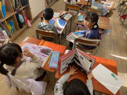 1年生の国語では、『いろいろなふね』で学習したことをもとに、自分が調べてみたいと思った乗り物について調べていました。