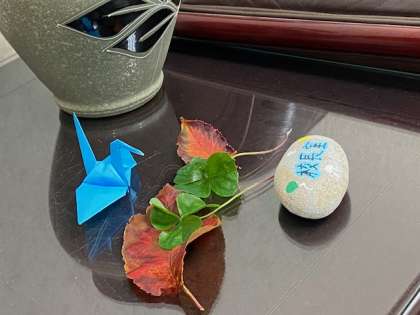 今朝は、登校してきた子たちからシロツメクサの葉と紅葉した葉、色紙をもらいました。色紙は早速、折り鶴としました(^^)
