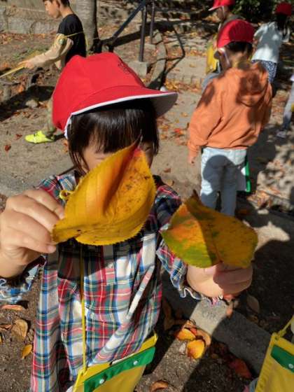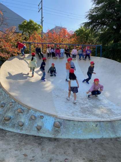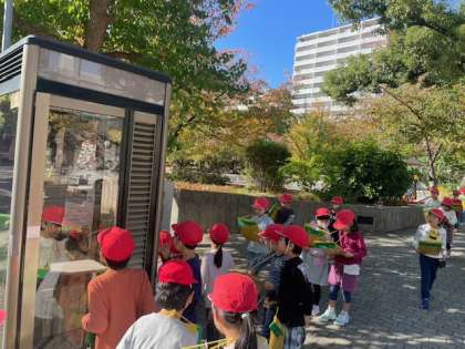 子どもたちは、公園には大きな葉をつけた木があって今は落ち葉となっていることや、電話ボックスがあることなど、たくさんの発見をしたようです(^^)