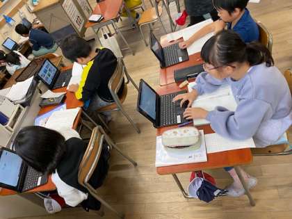 3年生の国語では、『パラスポーツのリーフレットを作ろう』と学習者用端末で情報や素材を集めていました。今回は特に、書いてある文章を要約することがポイントです。