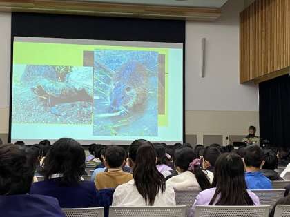 前半は全員で、動物園の飼育員さんから、絶滅危惧種の動物について映像を見ながらお話を聞きました。