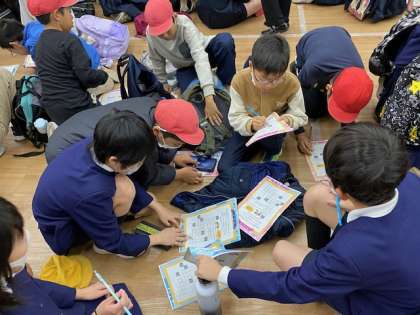 後半は、小グループに分かれて園内をクイズラリーをしながら回りました。集合場所に戻ってからは、天王寺小学校の子たち、聖和小学校の子たちとクロスワードを完成させました。