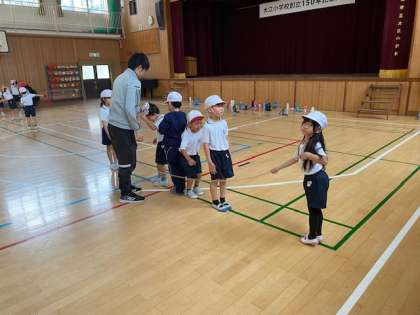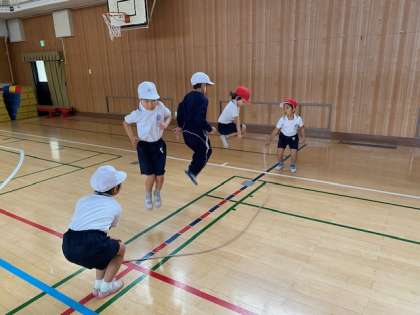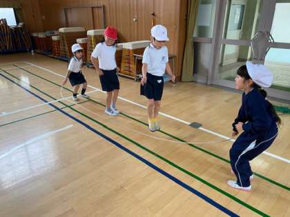 1年生の体育では、長なわにチャレンジしていました。まずは跳ぶ人を1人にして始めます。1人ができたら2人3人と増やして跳んでいきます。回し手もタイミングを合わせ掛け声をかけて優しく回して跳びやすくしていました。