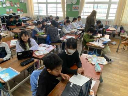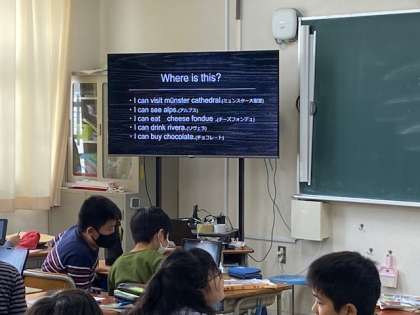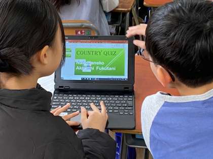 5年生の外国語活動では、1つの国を選び、その国の特徴的なことを説明することを活かして、クイズを作っていました。