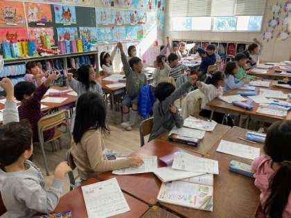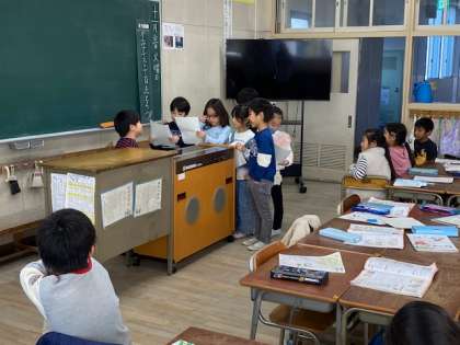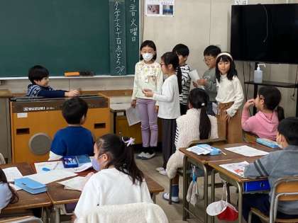 2年生の生活科で取り組んでいるまち探検では、先日グループで考えた質問を11月30日に、実際、お店に行って行いますが、その前に、今日は、お店役の人を決め、お店に行った時にする質問の練習を行っていました。子どもどうしのやりとりなので、とても面白いところはありましたが、互いに点検し合い本番に備えていました。