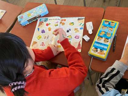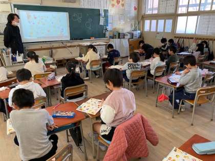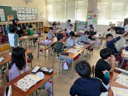 後半、ビンゴゲームで遊びながら今日の表現を習得していました。あらかじめ、教科書に書いてあるものの中で6つ選びます。先生がランダムに教科書の中のものを言います。6つとも合ったらビンゴとなります。