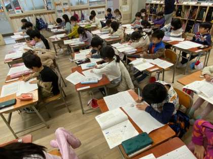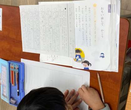 1年生の国語では、『おもい出してかこう』ということで、運動会のことや夏休みに遊びに行ったことなど、印象に残っていることを思い出し、作文にチャレンジしています。