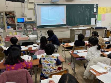 特に、今日は下書きを原稿用紙に書くことに取り組んでいました。書き方については、書画カメラで先生の見本を写し、間違えないようにして書いていきます。
