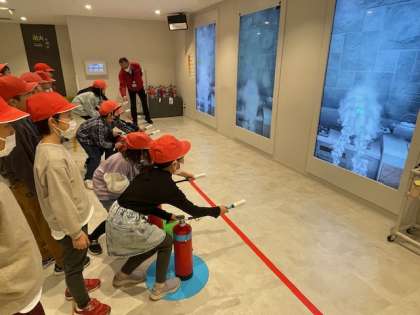 消化器を使った初期消火、煙中避難などの体験をしました。災害が発生した時、どんなことができるのか、体験を通して学習しました。