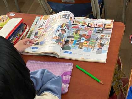 5年生の外国語の学習では、ファーストフード店に家族で行ったシーンのやり取りを聞いて、誰が何をオーダーしたのかについて学習していました。