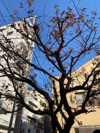 今朝の天候は晴れ、気温4度と底冷えの朝です。枯葉の向こうに見える青空がとても鮮やかです。
