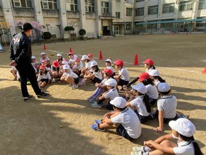 2年生の体育では、2人ペアで蹴ってボールをパスすることに取り組んでいました。