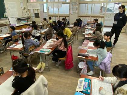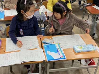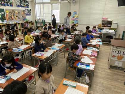 1年生の算数では、繰り下がりのあるひき算の練習問題に取り組んでいました。てきぱき計算している子もいれば、なかなか苦戦をしている子もいましたが、みんな一生懸命取り組んでいました。