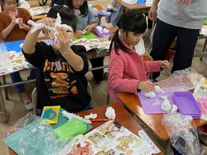 1年生の図工では、粘土で動物を作っていました。教室内を歩けば「これ、何に見える?」のオンパレード。「椅子」と答えると「ちがう!」と。よく見るとギザギザしたものが付いていて歯に見えてきました。「かば!」と答え直すと「せいかい!!」と勢いよく返ってきました。