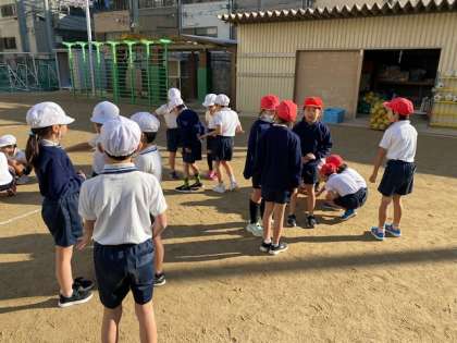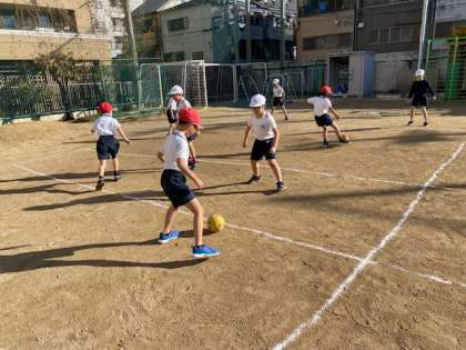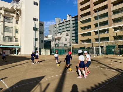2年生の体育では、ボールを蹴って相手陣地にシュートを決めるゲームに取り組んでいました。
