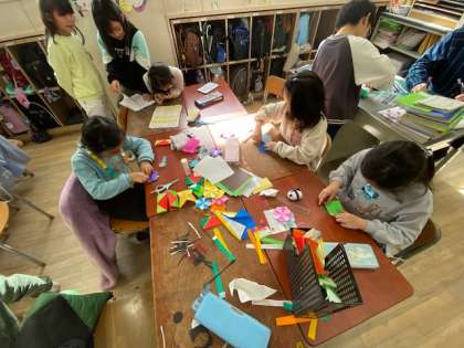 折り紙を折っている子に尋ねると、12月お誕生日の子にあげるメダルを折っている、ということでした。中には『すごろく』を作っているグループもありました(^^)