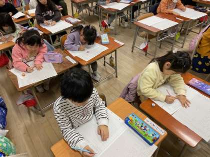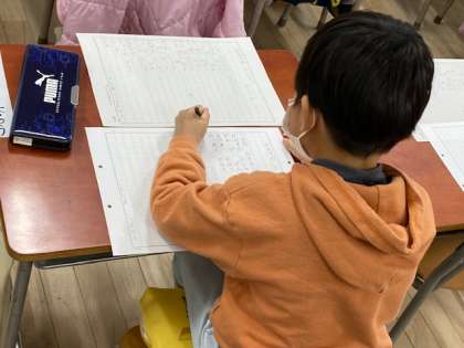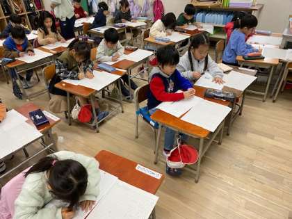 まずは、最後に書く自分の名前の文字の位置を確認した後、原稿用紙に自分の名前を書き、その上で、全体の半分を、お手本をよく見て書き写しました。書く姿勢も気にしながら一生懸命書いていました(^^)
