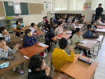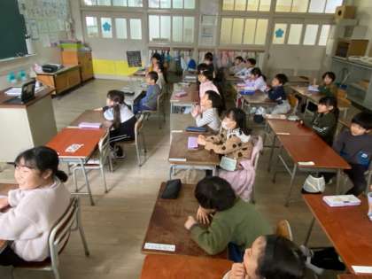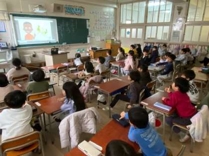1時間目が始まる前、1年生の教室をのぞいてみると、英語の『チャンツ』に取り組んでいました。