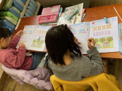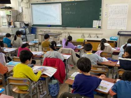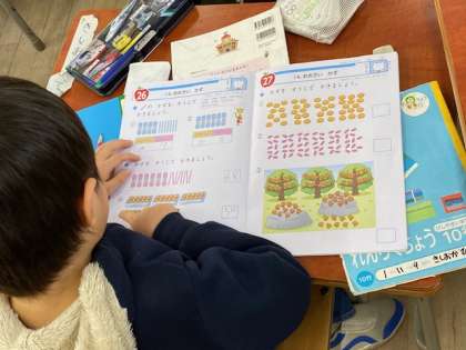 1年生の算数では、『おおきいかず』の練習問題に取り組んでいました。「前回、同じような練習問題をしたときに数えもれがありました。」という先生からのひと言を受け、子どもたちは数え漏らさないと一つ一つ数え直していました。
