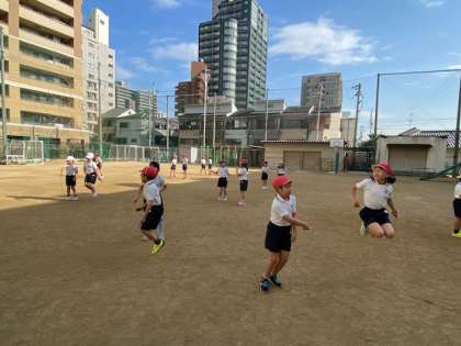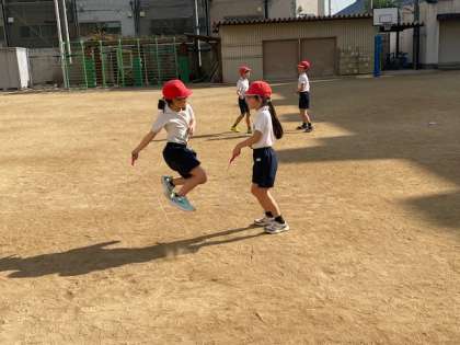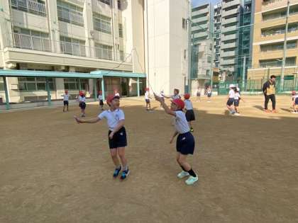 2年生の体育では、なわとびをしていました。1人で跳んだあと「2人とび」へ。先生が「では2人組になってー」と声をかけると、互いに声を掛け合って、上手に2人組に分かれていました。急造の2人組ではありましたが、タイミングを合わせて仲良く跳んでいました。