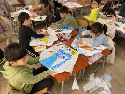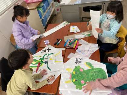 1年生の教室をのぞいてみると、自分の描いた絵のたこを飛ばそうと、手作りたこに絵を描いていました。