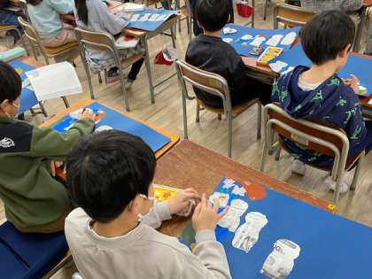 2年生の図工では、国語で学習している『かさこじぞう』に出てくるワンシーンを絵にしていました。