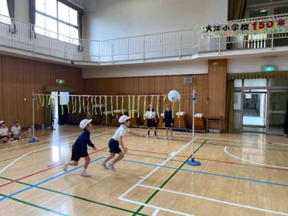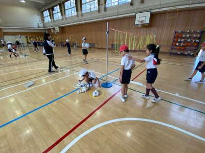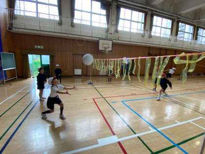 2年生の体育では、キャッチバレーボールに取り組んでいました。と言ってもサーブやアタックしません。相手コートに投げ入れて、自陣にきたボールをキャッチする、というもの。