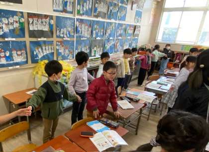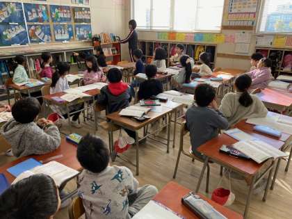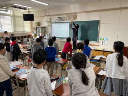 さらに、教室の横の長さを図ろうとしましたが、1メートルさしで測るにも何回もつないでいかないといけません。そこで子どもたちが手を広げた長さが大体1メートルとし、手をつないで大体の長さを考えていました(^^)