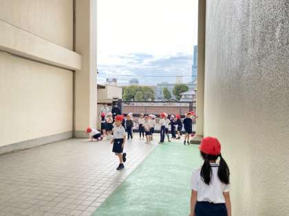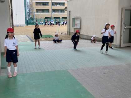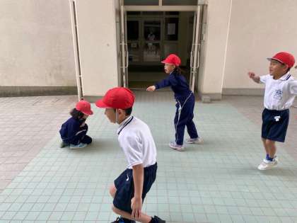 1年生は、体育時間、充分に体を動かしたあと、『だるまさんが転んだ』をして楽しみました。