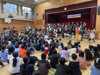 その前に、朝、児童朝会の終わりに予告なしで他の学年の子たちに向け、『情熱大陸』を演奏をしてくれました。