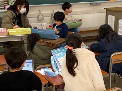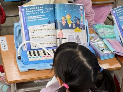 1年生の教室をのぞいてみると、鍵盤ハーモニカで『きらきらぼし』を演奏するテストをしていました。繰り返し練習をしてきたのですが、いざ先生の前で1人で演奏するとなると、とても緊張するものです。