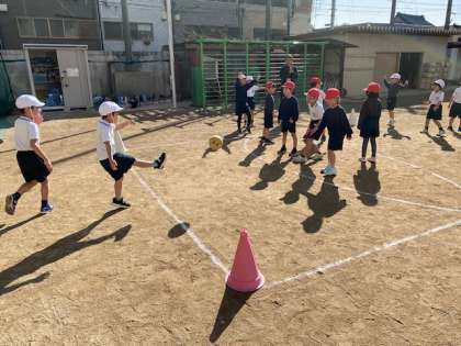 ボールを蹴る運動もだんだんサッカーに近づいてきました(^^)