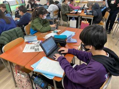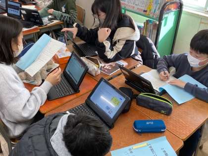 6年生の社会では、『平和について考えよう』ということで、先週の社会見学で得た情報や、これまで学んできたことをもとに、『当時の人々のくらし』をプレゼン資料にまとめていました。