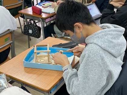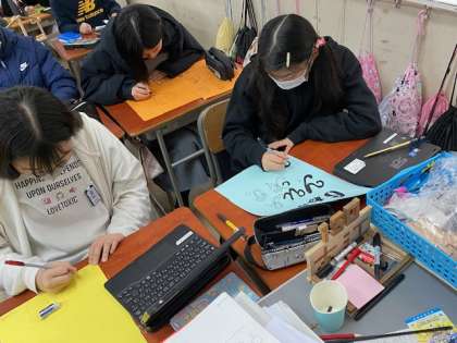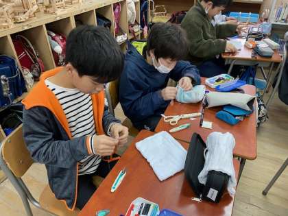 6年生の教室をのぞいてみると、ある子は雑巾を縫い、ある子は図工の組み木細工に取り組み、ある子は作品綴りの表紙の絵を描き、と。それぞれ自身の製作に取り組んでいました。