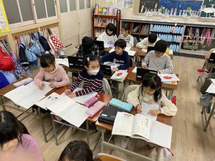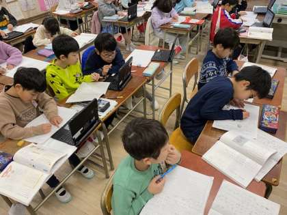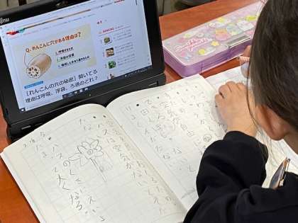 2年生の国語では『あなのやくわり』という説明文を学習していますが、ちくわやドーナツなど、50円玉以外に穴の空いているものについて、どうして穴が空いているのかを調べ、調べたことをもとに作文していました。