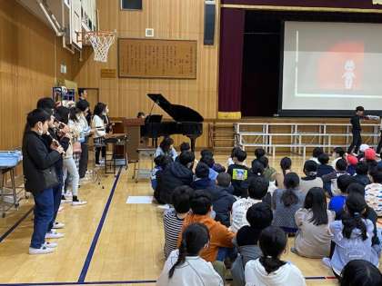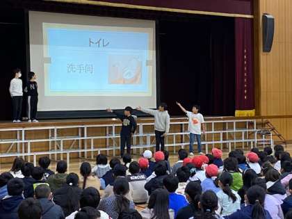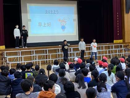 5年生の報告では、SDGsなどいくつかのチャレンジをしてきましたが、今日の報告では、今年までに大江小学校へ中国から転入してきた子をきっかけに、中国語を150個マスターする目標を掲げて取り組んだことにフォーカス。今日の報告会で、即席の中国語講座をしてくれました。
