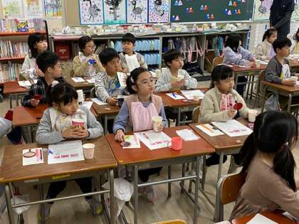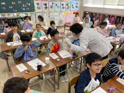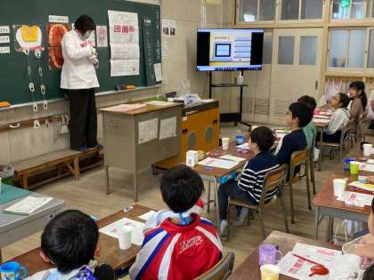 今日は、教育委員会から来られた歯科衛生士さんと歯科の校医先生とで、2年生の子たちに『はみがき指導』をしていただきました。
