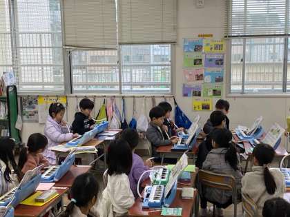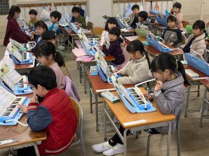 1年生の音楽では、『こいぬのマーチ』を鍵盤ハーモニカで吹く練習をしているのですが、今日は班で合わせて演奏し、そのでき具合を聴き合いました。