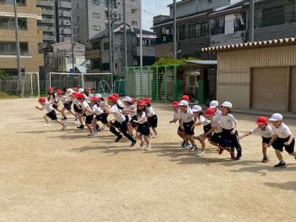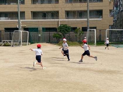 鬼は帽子を赤にして鬼ごっこがスタートします。子どもたちの歓声とも悲鳴ともとれる声が響いていました(^^)