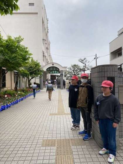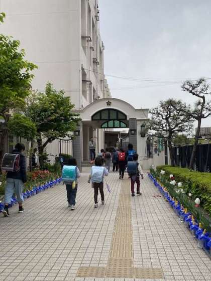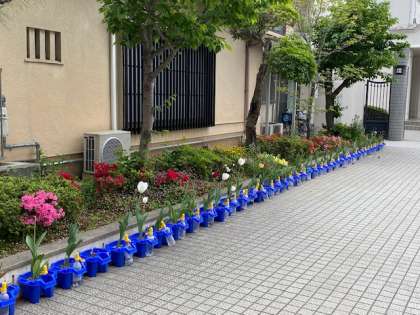 子どもたちが登校するプロムナードには、チューリップのほか、色とりどりの花が咲いています(^^)