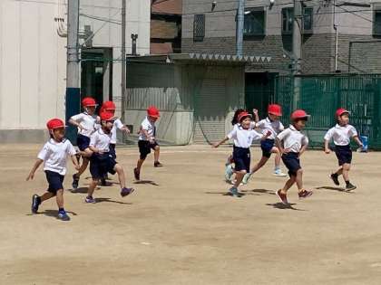 最初は、かけっこ。次にスキップ。最後は座った状態から立ち上がってかけっこ。色々なかけっこをしました。