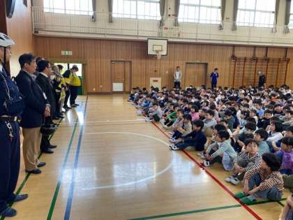 今朝の児童朝会では、日頃私たちの安全を見守ってくださっている地域の方々、区役所の方々、警察の方々にお越しいただき、校長先生から紹介がありました。