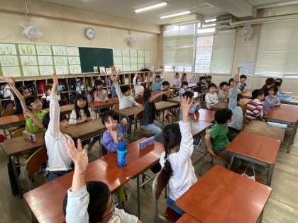 2年生の教室をのぞいてみると、列対抗でクイズ大会をしていました。