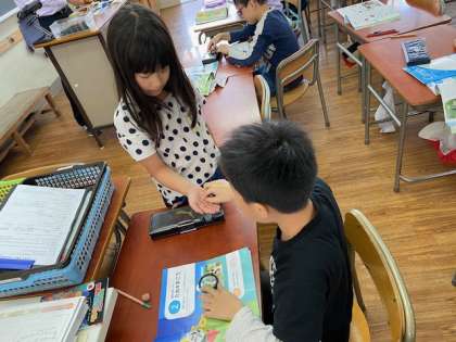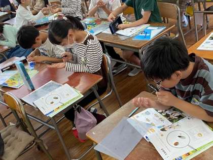 前半、子どもたちには、虫眼鏡が配られ、観察に必要な虫眼鏡の使い方について学習をしました。