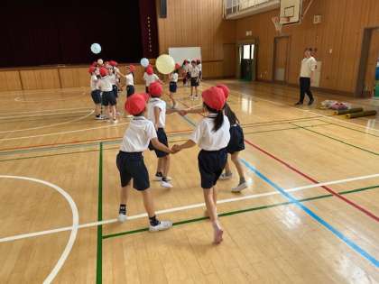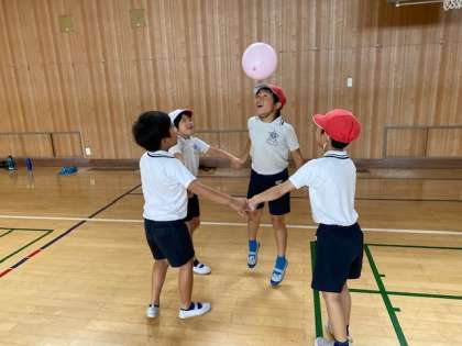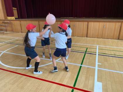 3年生の体育では、マット運動のあと、『手つなぎ風船バレー』に取り組みました。