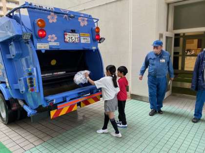 今日、4年生の社会科では、環境局より職員の方にお越しいただき、パッカー車のことについて、体験させていただきながら、パッカー車の秘密や日頃の仕事内容に迫りました。