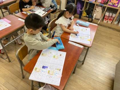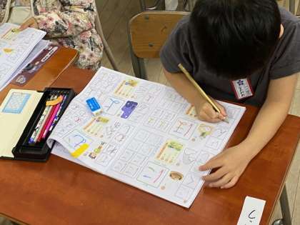 1年生の教室をのぞいてみると、平仮名の練習をしていました。